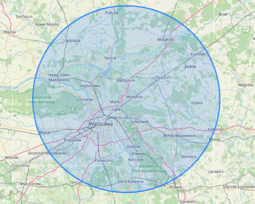 Warszawa oraz okolice, Wołomin, Zielonka, Ząbki, Marki, Nieporęt, Legionowo, Wieliszew, Serock, Wyszków, Węgrów, Otwock, Mińsk Mazowiecki, Mrozy, Nowy Dwór Mazowiecki, Tłuszcz, Grodzisk Mazowiecki, Żyrardów, Nadarzyn Radzymin, Siedlce, Węgrów.